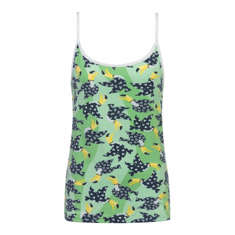 Женская домашняя летняя майка Mey (Мей) выполнена из модала с хлопком и небольшим добавлением эластана. Особенности: легкий цветной трикотаж с модным рисунком "туканы", облегающий силуэт, тонкие бретельки, длина изделия классическая.